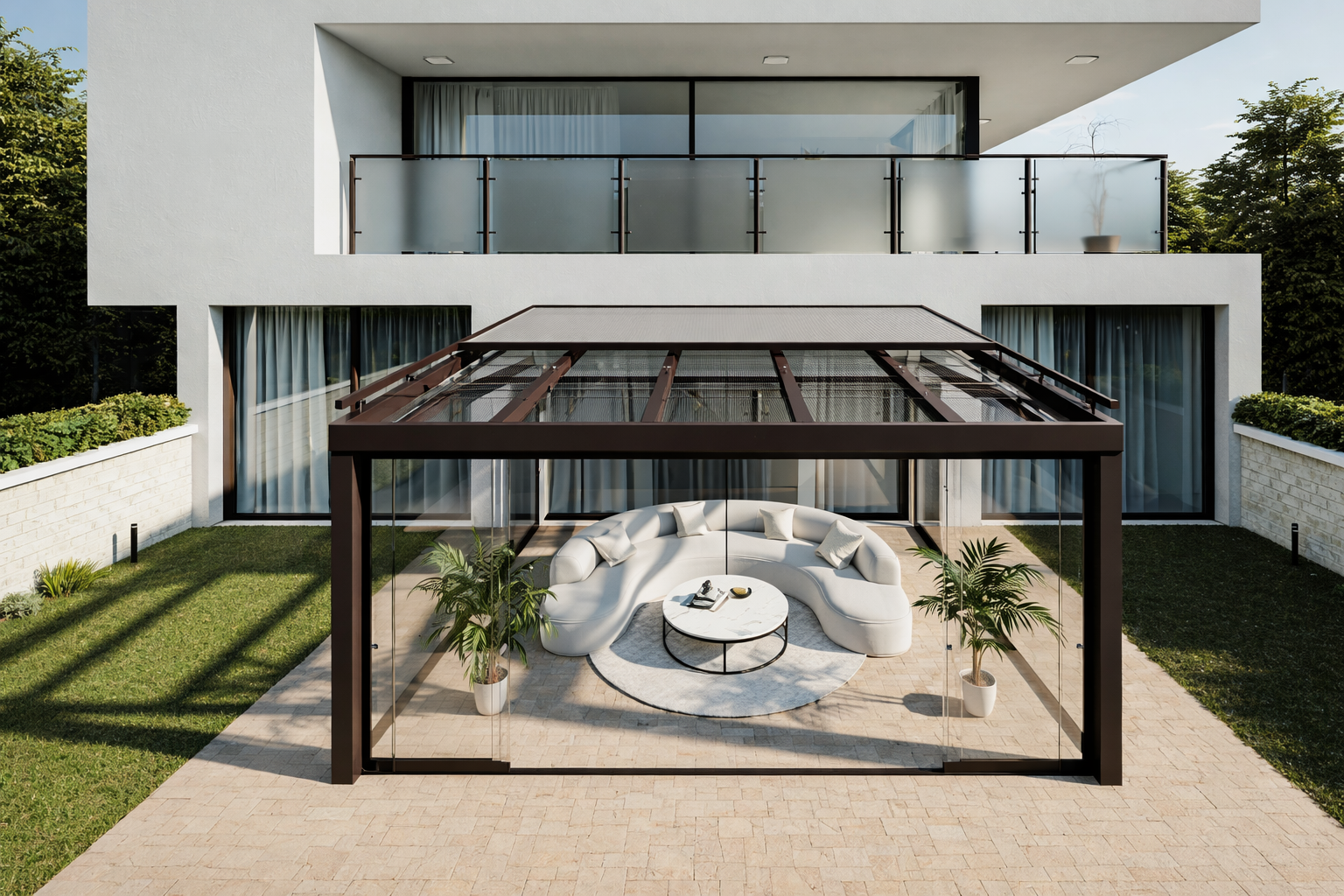 Hliníková pergola s bezpečnostním sklem, vysoká odolnost, dlouhá životnost